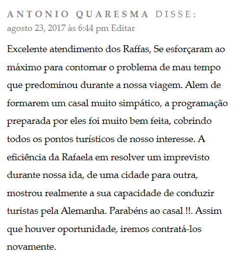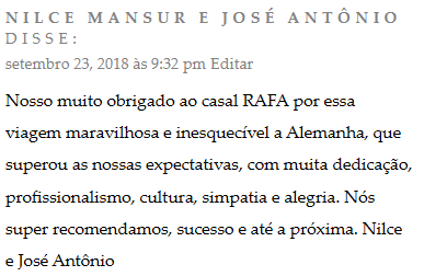 “Nosso muito obrigado ao casal RAFA por essa viagem maravilhosa e inesquecível a Alemanha, que superou as nossas expectativas, com muita dedicação, profissionalismo, cultura, simpatia e alegria. Nós super recomendamos, sucesso e até a próxima. Nilce e José Antônio”